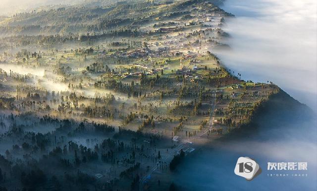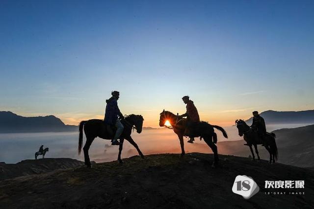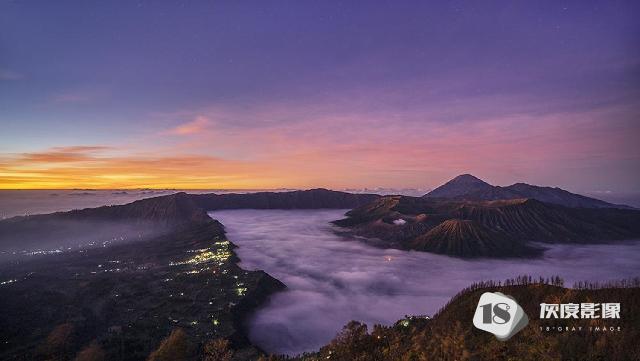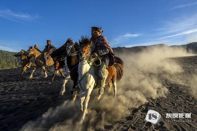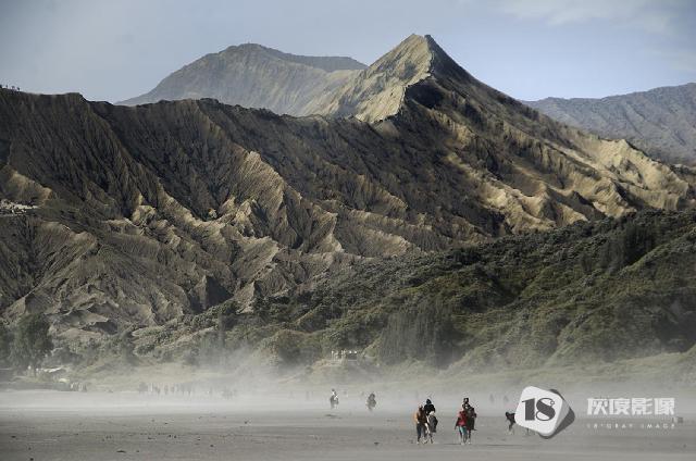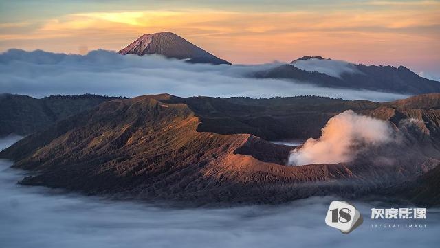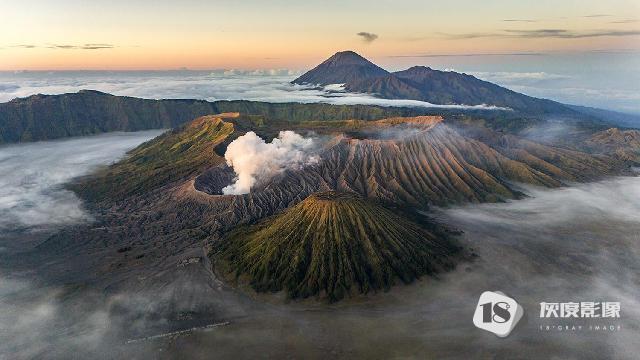 “月球地貌”奇观——布罗莫火山,它是布罗莫-腾格尔-塞梅鲁国家公园的核心景观,周围环绕着沙海,火山灰平原(沙海)上耸立着布罗莫火山,日出时云雾缭绕,宛如异星世界。